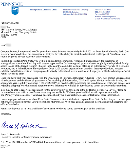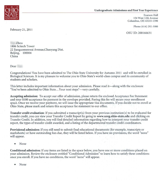 恭喜加成客户周同学获美国俄亥俄州立大学 、Penn State University、Wiscosin-Madison录取通知书!
